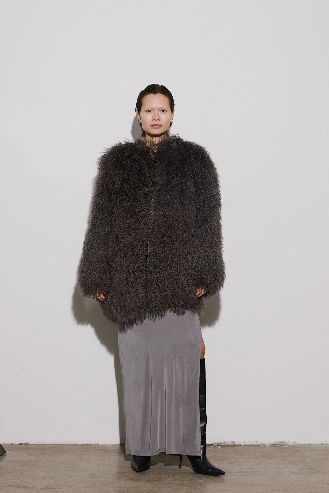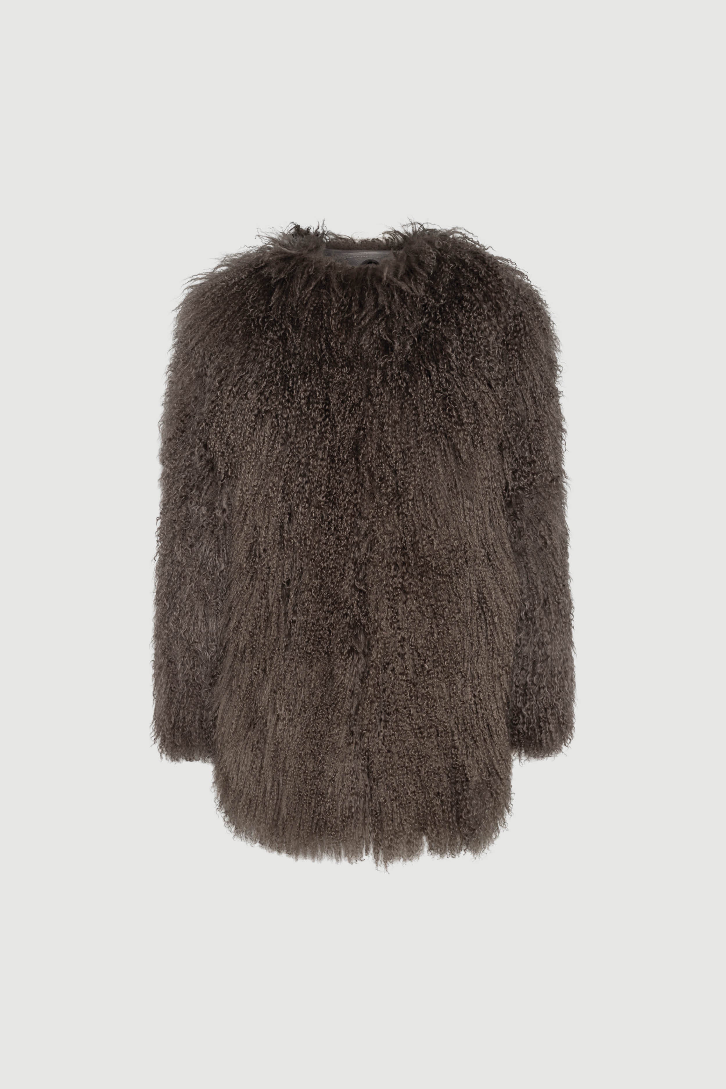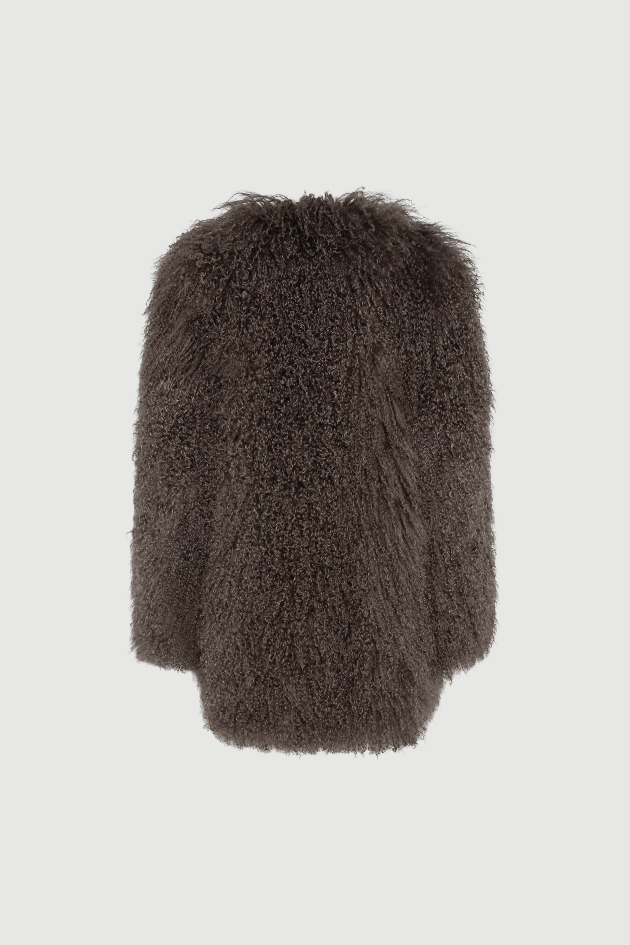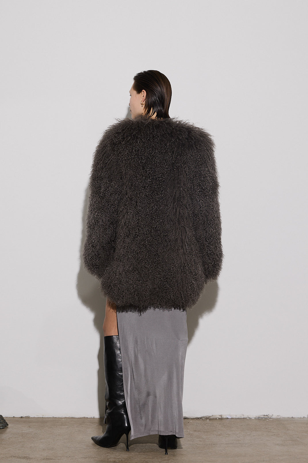 The All Night coat – not just cozy, but the puffiest of the bunch. Now available in an elegant grey, this coat is perfect for your winter wardrobe. Crafted from soft Tibet lamb, it envelops you in warmth and style. The hook-and-eye closure adds a touch of sophistication, while the two front pockets combine practicality with chic design.