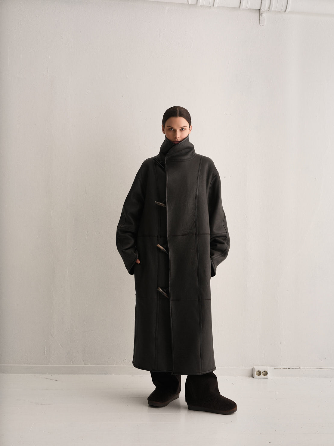 Introducing one of this year’s newcomers: the Hawk jacket long. Featuring toggle closures, this versatile jacket is fully reversible, wear it with the cozy shearling side out for warmth, or switch to the sleek leather side for a bold, polished look.