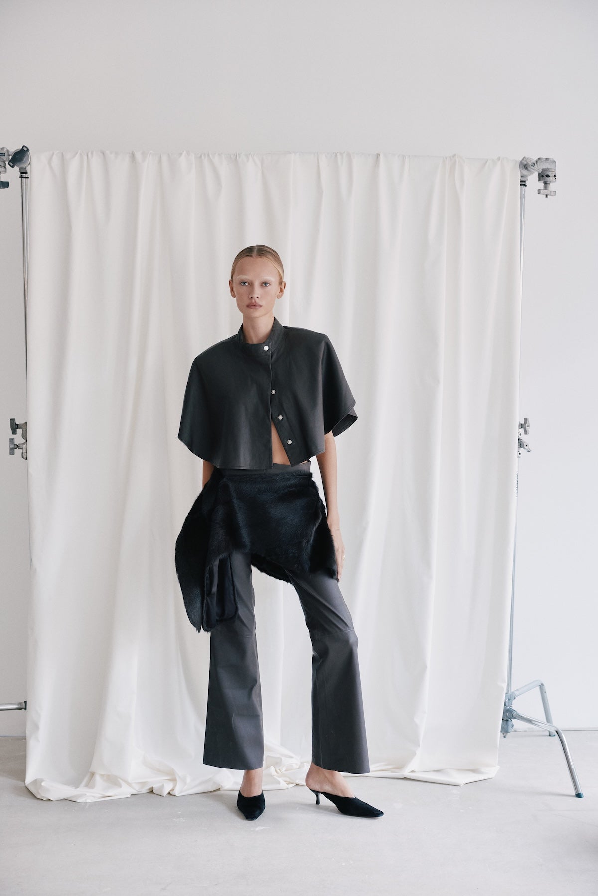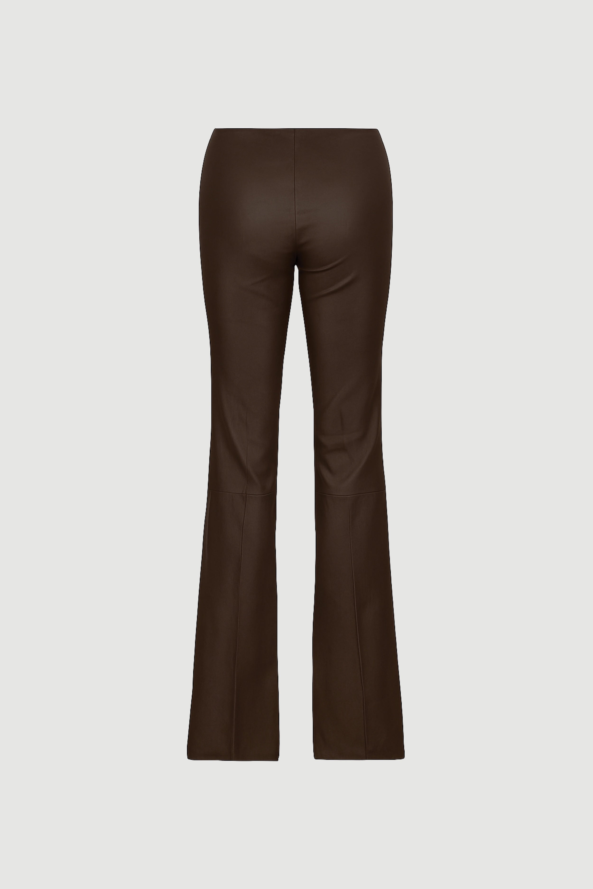 The Lenny leather pant is the ultimate wardrobe staple. Effortlessly wearable for everyday looks and elevated enough for evening or party styling. Crafted from soft stretch leather, it features a high-waist fit, hidden elastic waistband, and full-length flared legs for a sleek and comfortable silhouette. Designed with a cut-and-sewn detail above the knee and a raw-edge hem for a modern finish. Fits true to size. Pair with the Zoe Cape for a complete statement set.