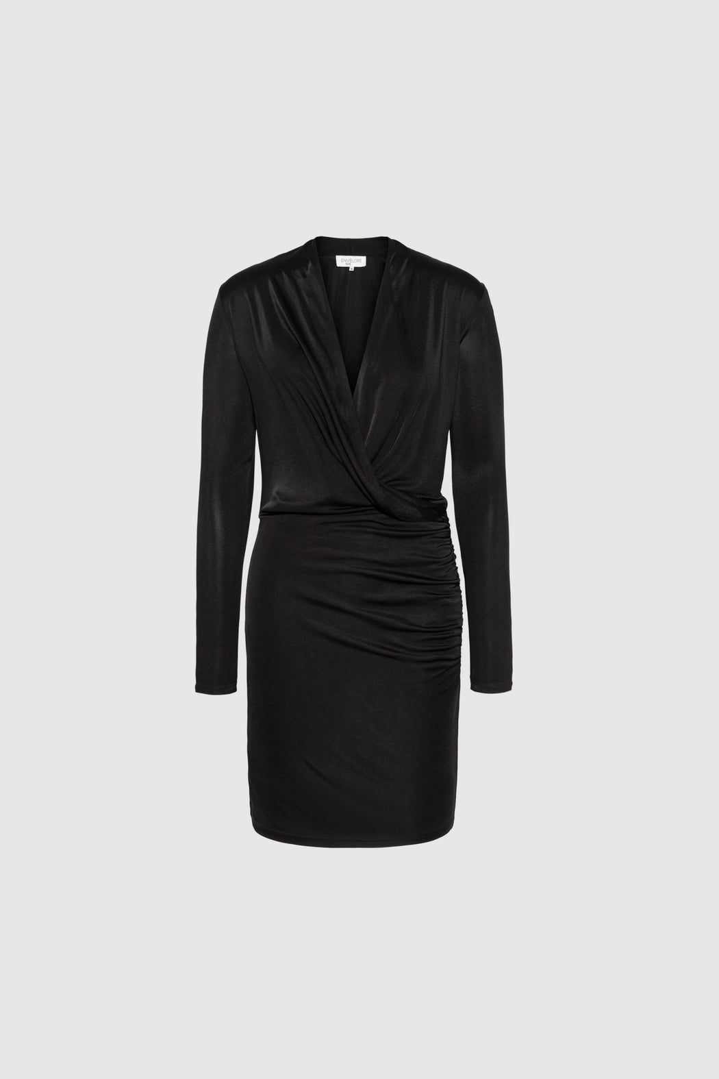 The Opening dress short is a mini-length version of its elegant counterpart, crafted from an exclusive blend of viscose and silk. With its oval opening at the front and graceful drapery, this dress exudes sophistication. It features long, slender sleeves and a side slit, making it the perfect party dress for the season.