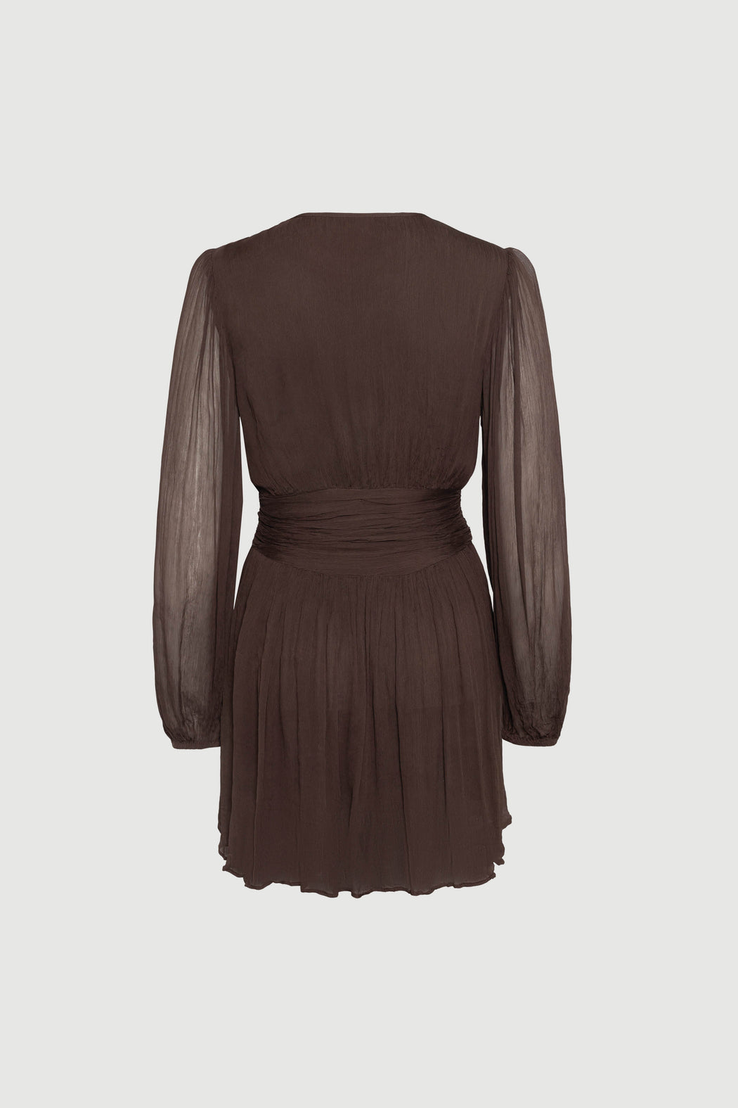 The Riviera dress short – A bohemian-inspired style, now in dark brown. Designed with a relaxed fit, long sleeves, and a flattering V-neck, it features a defined, belt-like waist for subtle structure. Mini in length and effortless to wear—perfect for warm days and easy styling.
