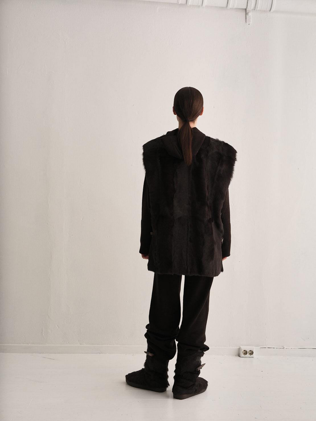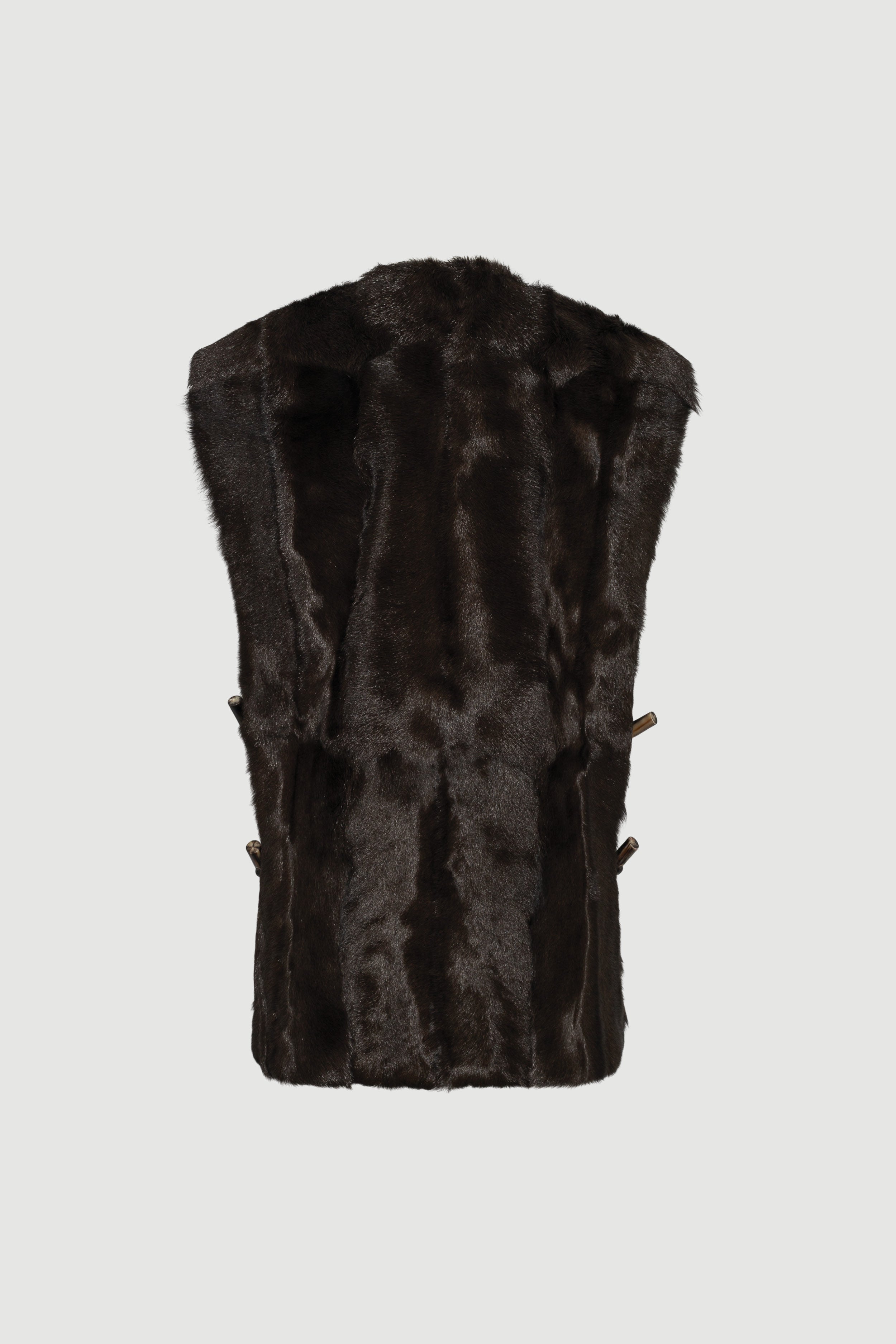 The Ustetind vest returns this season in a new color, crafted from goat shearling. Featuring distinctive side details with leather button accents and metal hardware, this design combines style and function. It includes a front hook-and-eye closure and adjustable side openings for a customizable fit, perfect for layering through the autumn and winter months.