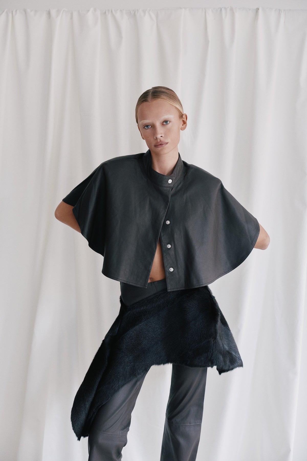 The Zoe cape is a standout leather piece designed to elevate any look. Featuring a clean button closure, structured shoulder pads, and full lining, it delivers a sharp, sculpted silhouette. Wear it layered for everyday styling or as a bold party top, the versatility makes it a key statement piece this season. Perfectly paired with the Lenny pant, and seen on the runway.